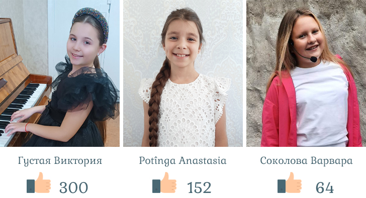 Победителем открытого голосования стала ГУСТАЯ ВИКТОРИЯ (Республика Молдова, г. Бельцы), набравшая максимальное количество голосов за отведенное время. 300 голосов, именно столько раз проголосовали пользователи сайта за данного участника.